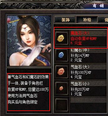 普通的魔血石已经跟不上时代了!因此极品魔血石应运而生,加量不加价,可以恢复HP和MP总计高达100万,几乎是以前的5倍!让你战斗更爽!