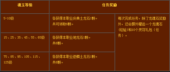 1.魂玉等级5-10级各领取并完成相应任务后可获得一个本职业庆典土龙石,共6颗。