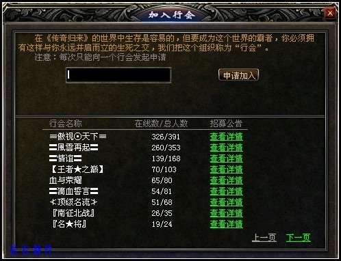 随着级别的增高,各大帮会开始建立。各路的老板及各大指挥招兵买马,在新区抢占先机、力求更多的玩家加入他们行会,为以后强大力量而努力,以便将来大展宏图,也为新区带来了无限生机!