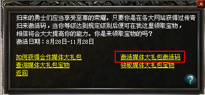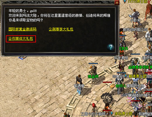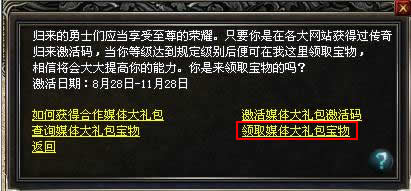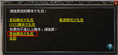 登录公测新区“盟重贵宾特使”选择“合作媒体大礼包”。