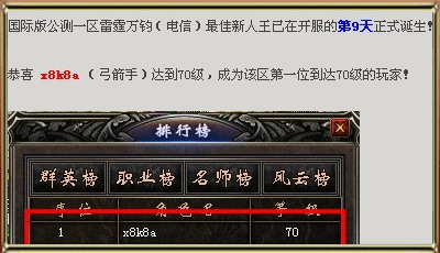 《传奇国际版》公测一区雷霆万钧(电信)火爆开启后,人气劲爆异常。这里一直不乏名人的加入,各路英雄豪杰也在此集结,比拼实力,展现自我!“最佳新人王”的开启,玩家纷纷向排行榜发起了冲击。龙争虎斗,让高手不再寂寞,让较量跨越时空。在经过激烈的竞争后,“最佳新人王”已在开服的第9天正式诞生!