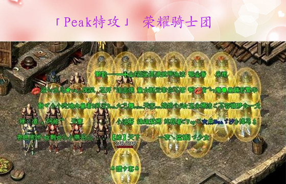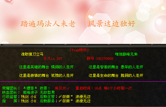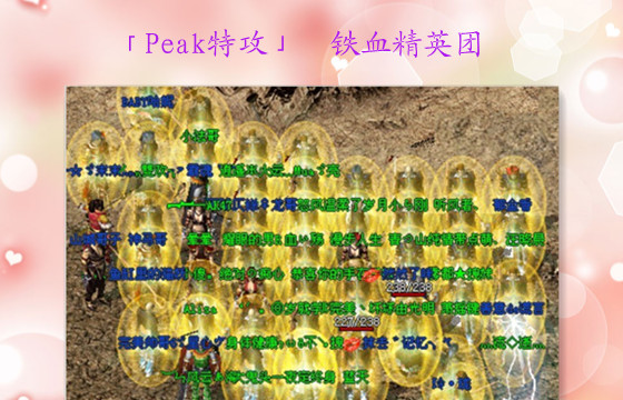 因为有着共同的爱好,我们走进传奇;因为志趣的相投,我们成为兄弟姐妹,为了集体的荣誉,我们并肩战斗,坚定彼此的信念,铸就不朽的战魂,执着的相信,没有一辈子的游戏,却有永恒的友谊!这就是「Peak特攻」。这里齐聚了一群热爱传奇的热血儿女,沉淀了一群喜欢激情的骨灰玩家,打造了一支战斗力顽强的铁血队伍!