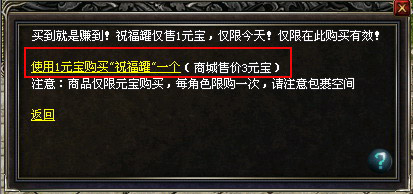 本次活动仅限元宝购买,才能享受特惠。由于活动力度空前,每个角色仅限购买1次哦。