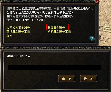 国际版全球公测黄金激活码需要在游戏内盟重-贵宾使者处激活。选择“国际版黄金激活码”,输入或复制粘贴激活码,立即可以激活成为黄金账号!