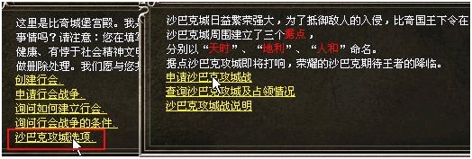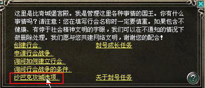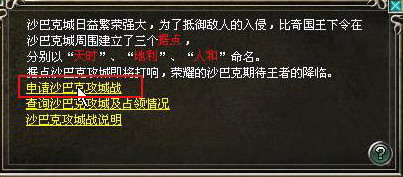 1. 攻城的行会会长向比奇城皇宫内的国王选择攻城选项,提交一个祖玛头像申请攻城。首次攻沙,沙巴克为空城,所有的行会都可以提交祖玛头像。