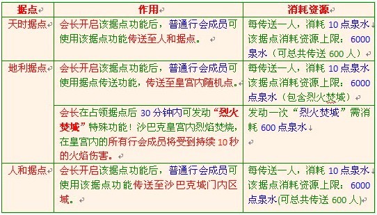 行会在占领天时、地利、人和三个据点后,如想使用该据点的特殊功能,必须消耗一定的“行会泉水”,因此战前行会必须准备充足的“行会泉水”!