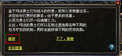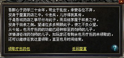 3、 如玩家原先在药剂师处还有剩余的包月疗伤药未领取的,仍可以在药剂师处继续领取。