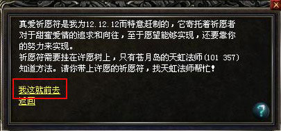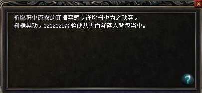 玩家还可以在节日大使处免费领取“真爱祈愿符”一枚,只要按照要求去苍月岛天虹法师处悬挂在许愿树上,就能获得相应经验奖励哦!