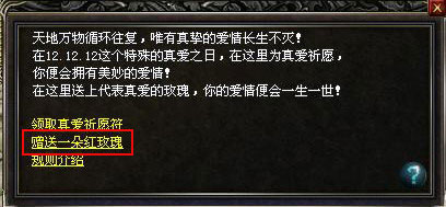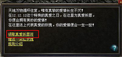 注:每位玩家只能领取1次真爱祈愿符。公测5区、6区玩家最多只能递交1次红玫瑰。1-30区、公测1-4区玩家最多只能递交2次红玫瑰。机会有限,仅此1天!