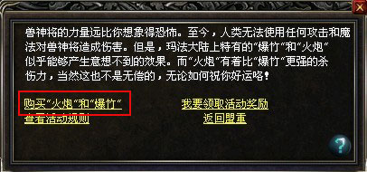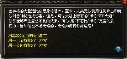 但是,玛法大陆上特有的“爆竹”和“火炮”似乎能够对兽神将产生意想不到的效果。而“火炮”有着比“爆竹”更强的杀伤力,勇士们前往屠魔的路上,还是要先准备好“爆竹”与“火炮”(可在活动使者处购买)。