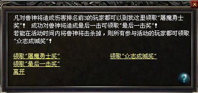 屠魔勇士奖:活动结束后对兽神将造成伤害最高的三名玩家将会获得额外奖励:一个金砖、50张灵符凭证以及800w经验(按照攻击伤害,以及攻击时间排序,玩家可实时查看右上方全服排行榜))。