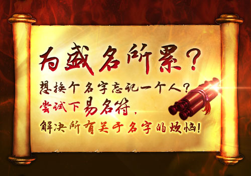是否觉得自己的名字不够响亮?是否对用了这么久的名字已经再无新鲜感?是否对于刚接手的这个角色的名字不甚满意?是否厌倦了江湖的纷争想换个身份清净一下?是否想在某个特殊的日子和朋友开个不大不小的玩笑?