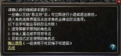 2、当玩家使用易名符改名后,原角色名将被锁定,其他人均不可使用。(此项仅在互通前有效,服务器互通后原角色名将取消锁定)