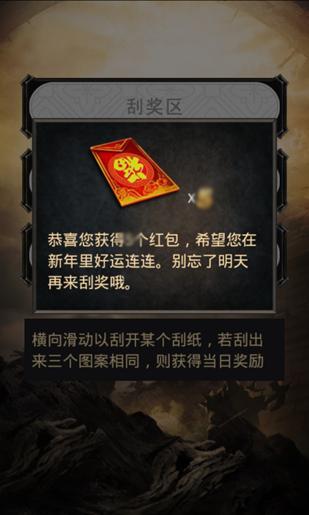 玩家每天都可参与一次春节刮刮乐的游戏。玩家若没有刮出相同图案,可一直游戏直至获取奖励。