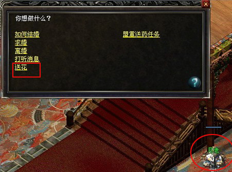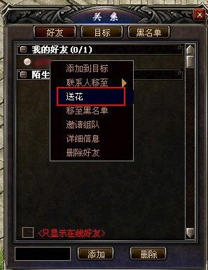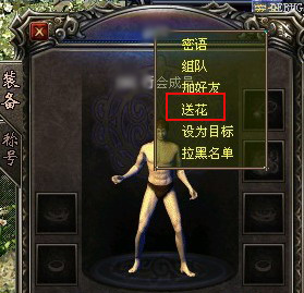 A:送花有多种途径。(1)打开“魅力榜”,点击“我要送花”按钮;(2)在好友列表中,右键好友名字,点击“送花”;(3)当面Ctrl+右键,查看玩家信息时,点击其装备页的名字,选择“送花” (4)通过庄园月下老人和姻缘神殿月老处,发起送花。