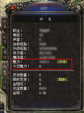 A:在个人状态信息页面(F10)的“状态”页可查看我的魅力以及今日魅力。