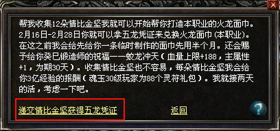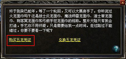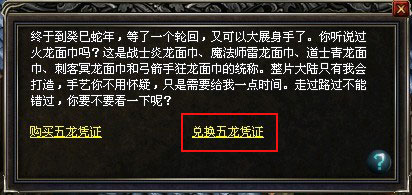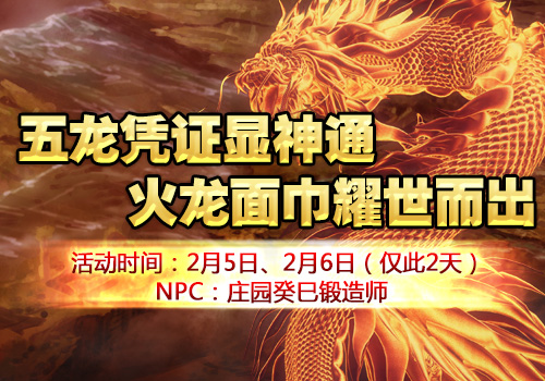 2月16日—2月28日,玩家凭五龙凭证可去癸巳锻造师处领取火龙面巾(本职业)!