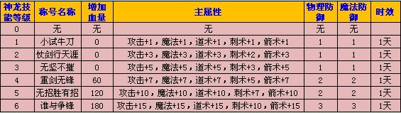 凡是领悟了1级以上神龙技能的玩家,活动期间每天都可以到节日大使处领取一个有实效的神龙称号!领悟神龙技能的级别越高,可以获得的称号级别越高!