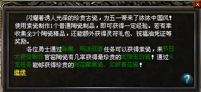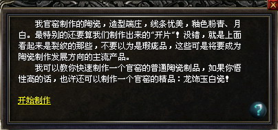 玩家在除魔、玛法巡游任务可以获得素瓷。然后可以开始制作官窑陶瓷。
