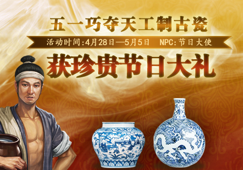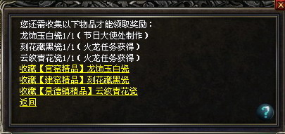 玩家如集齐3种精品刻花藏黑瓷、云纹青花瓷、龙饰玉白瓷,将获得节日大使的神秘大礼一份!