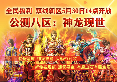 2013年《传奇归来国际版》双线新区公测八区:神龙现世将于5月30日14点盛大开启!本次双线新区将为广大玩家狂送福利:装备熔炼系统即将推出,玩家投入低级装备熔炼,通过积累即可兑换高等级装备!沙巴克荣誉战新增“贝勒爷”时装奖励、五职业神龙技能全面上线,全新升级方式“迷雾寻宝”,带来更多激情与乐趣!绿色新区,更合理的命名规范。新区大礼包,先到先得!有魔血石有藏宝阁。