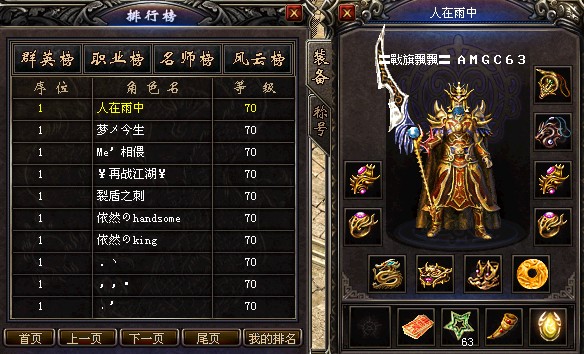 在线人数第五多的是〓戰旗飄飄〓,相信在老区的人也很多都知道这个行会。AMGC63,没错,战旗飘飘依然是AMGC63的行会。他在这区改名人在雨中,和烟花江畔再一次一起撑起了〓戰旗飄飄〓,一身王者依然是他一惯的装扮,成千上万的玩家里,他依然淡定的占据了NO.1?