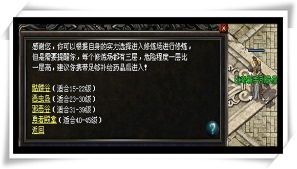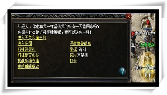 现在所有地图都老兵,都可以传送到相应的地图。安全区四周,都有各种NPC在那里。玩游戏,先把所有NPC的功能弄清楚。因为所有的NPC,都不会无缘无故的站在那里的。一样一样来了解清楚以后,对游戏生涯有很大的帮助。你了解这些功能以后,不会因为要去祖玛大厅,从祖玛寺庙跑步过去,堪比红军长征。新手要习惯使用游戏里有问必答里的彩虹帮助,任何大大小小问题基本上都可以得到答案。
