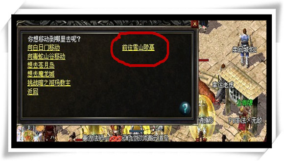 雪山地图呢,在土城(盟重省游戏里都是叫土城)安全区右边有个公告牌。点击公告牌,点左上的黄字使用移动就可以前往雪山陵墓,到达雪山地图了。