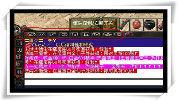 点这些按钮,有地图的,行会的,组队的。还有排行榜,关系系统,等等。左边的按钮,则是各种方式的聊天信息和喊话开关。现在要加入一个行会,都可以点击行会信息按钮,远程申请加入。如果等级不够,也可以面对面打@加入门派让有权限的行会管理收你入会。要组队呢,就把组队按钮用鼠标右键一点,就打开了。也可以鼠标左键点开组队按钮,把队友名字输入。还有一种就是快捷键组人----按住键盘ALT的同时,按W键,右手鼠标指着你要组的人物,这样就可以很快的组上人了。快捷键如果组不上,一般是和QQ热键冲突。把QQ关掉或者QQ热键重新设置一下就好了。