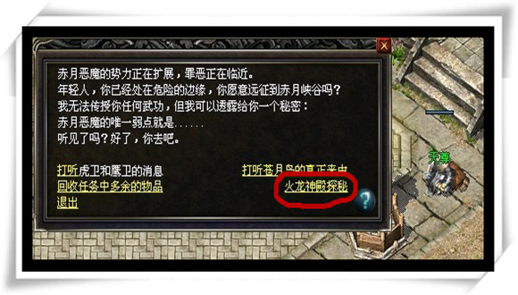 除了以上的任务活动以外,当等级达到45级,每周还可以到白日门天尊接火龙任务。新手一定要听老玩家的指挥,因为在火龙神殿里的蝙蝠和火龙,随时都能把你秒杀。站到火龙神殿的无敌点打,或者到安全的角落等老玩家打完,你跟着混经验就好了。