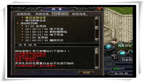 在游戏里打开人物的任务日志,在日常活动这一栏里。清楚的标记了所有系统的任务活动,上面有具体的活动时间。在任务描述里,也可以看到每个任务可以得到的宝物,活动启始的NPC到哪里找,都做了详细的解说。系统的活动几乎是二十四小时不间断的。只要你有时间上游戏,随时可以参加各种活动。
