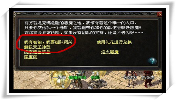 还有一个,就是新手经常搞错的地方:组队打卷和组队下地下宫殿。新手喜欢去这两个地方去刷怪打钱和打大太阳水。这两个集体活动,需要点的都是土城安全区左下角的镇魔守将。但是打卷的,是点开镇魔守将以后,点左上的“我有卷轴,我要组队闯关”而下到地下迷宫和宫殿长廊的,要点“解救天工神剪”。注意这两个地方的不同。