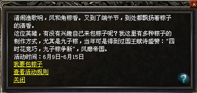包出宫廷九子粽,将随机获得以下奖励1件:7级火龙珠、24张灵符、12个灵符礼包(任务)、千里传音(大)、30张地下组队卷、30张祝福油凭证等