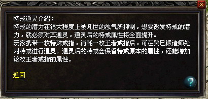 特戒通灵后,属性也将更为强大!通灵后的特戒消耗对应的王者级戒指和上古的材料可以继续兑换成其他同类通灵特戒,但未通灵的戒指以后将无法兑换。如修罗麻痹戒指可以加入魅影戒指和上古材料后,兑换成魅影麻痹戒指(稍后开放)。