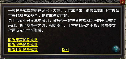 护身戒指通灵后可以臻化为摩罗护身戒指(法师)、或混元护身戒指(道士)、或月影护身戒指(弓箭手)