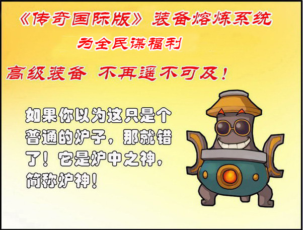 《传奇国际版》装备熔炼系统即将开启!传奇经济系统革命风暴,为广大玩家谋福利!高等级装备触手可及!如果你有不需要的装备,不妨投入熔炉重新炼造一番,通过提炼和积累,你就可以获得诸如:战神级、狂战级、圣魔级、混世级、真魂级、太极级、闪影级、避魂级、尖峰级、飞羽级、五职业传说级装备。
