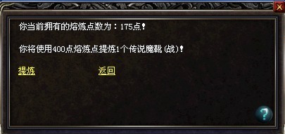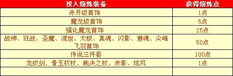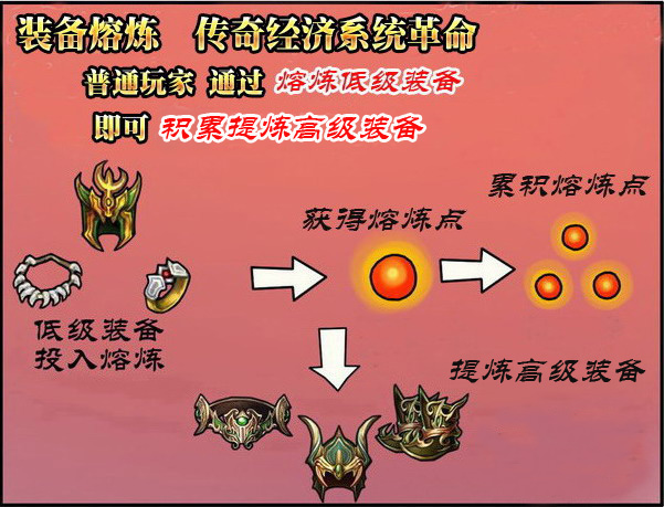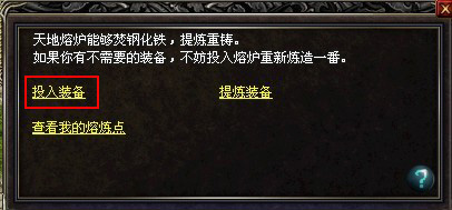 熔炼点:将你不需要的装备投入熔炼后,会获得一定的熔炼点(不同装备的熔炼点不同哦)。当你拥有一定的 “熔炼点”后,再使用“提炼装备”功能进行回炉再造,将获得新的装备。