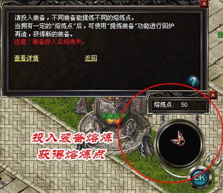玩家可在NPC“天地熔炉”处提炼新装备,玩家点击每一个选项,可以得知你想要提炼的新装备所需要的熔炼点。