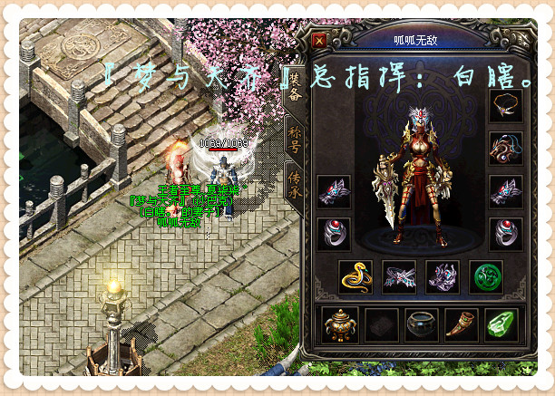 小漾寄语:认识鬼子源自于网通25区,这个原本在电信的指挥突然间来到网通区指挥深受大家的喜爱。曾经打过5区沙巴克 18区沙巴克 21区沙巴克 25区沙巴克 的鬼子特别喜欢开玩笑,每次都说自己是最受女性玩家喜爱的指挥。