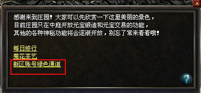 为保证玩家正常进入服务器,新区账号绿色通道已正式开启!你只要在庄园管家处开启绿色通道,你的账号将拥有特权,不再受人数限制,随时随地、直接进入游戏。即使本服务器已达到人数上限,你依然可以享受特权,顺利登陆游戏!