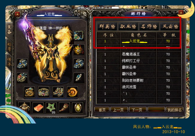 由于▂▃入云龙▃▂本人平时忙于生意甚少上线,也只能在晚上两方交战最热烈的时候碰到。(小漾认为,保命要紧所以没有截到战争中▂▃入云龙▃▂的身影。)但是这并不影响风云人物在战斗中的成绩,每次交锋▂▃入云龙▃▂依然冲锋在前,为后面大部队做好最充分的准备,像他的行会称号一样“神一般的人”