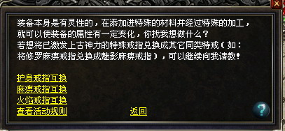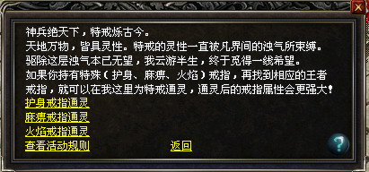 注:通灵后的特戒消耗对应的王者级戒指和上古的材料可以继续兑换成其他同类通灵特戒,但未通灵的戒指以后将无法兑换。如修罗麻痹戒指可以加入魅影戒指和上古材料后,兑换成魅影麻痹戒指。