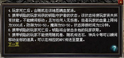 2、携带钥匙的玩家不能使用随机卷、随机传送石、神兵令等可以瞬间移动坐标的道具,可以在相应的NPC传送至盟重。