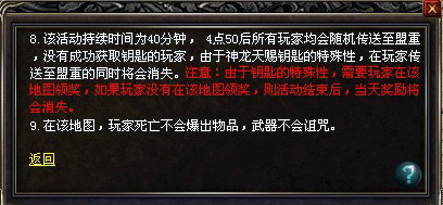 3、该活动持续时间为40分钟, 4点50后所有玩家均会随机传送至盟重,没有成功获取钥匙的玩家,由于神龙天赐宝箱钥匙的特殊性,在玩家传送至盟重的同时将会消失。注意:由于钥匙的特殊性,需要玩家在该地图领奖,如果玩家没有在该地图领奖,则活动结束后,当天奖励将会消失。