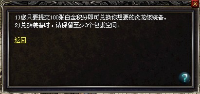 您只要提交100张白金积分即可兑换你想要的各职业炎龙级装备(护腕、项链、腰带、戒指、头盔、靴子),机会难得,切莫错过!