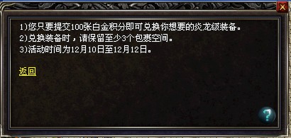 您只要提交100张白金积分即可兑换你想要的各职业炎龙级装备(护腕、项链、腰带、戒指、头盔、靴子),机会难得,切莫错过!