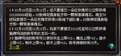 活动期间,玩家只要提交1212元宝可以立即获得驰骋玛法的称号(攻击上限+12,魔法上限+12,道术上限+12,刺术上限+6,箭术上限+12。称号持续时间15天)和本职业炎龙石一枚。