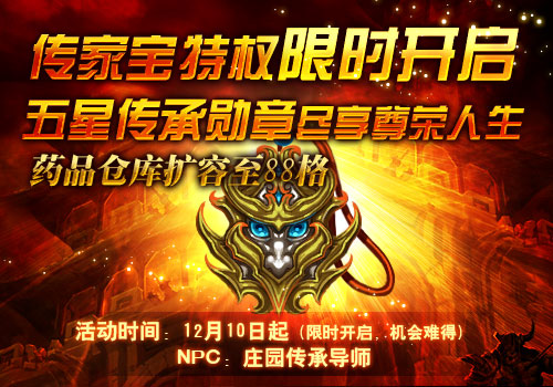 从现在开始,只要您在活动期间传家宝达到5星之后,就可以开启传家宝特权,传承导师将授予您一枚本职业的5星传承勋章,象征无上的尊荣,是游戏内顶级身份的象征!