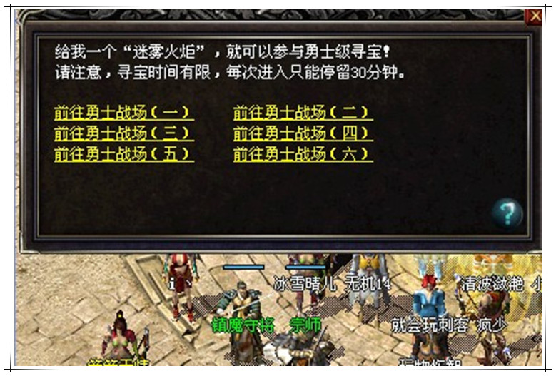 点开盟重安全区左边的镇魔守将,跳出的提示框右下角,点击迷雾寻宝;参加勇士级寻宝,选择进入到你想要去的房间。