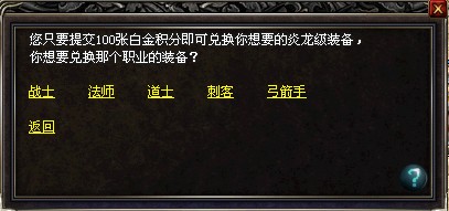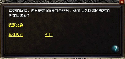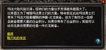 在新年即将到来之际,比奇国王为了增加玛法勇士们的力量。特命玛法统领在此给玛法勇士们带来了玛法大陆最耀眼的神器—炎龙装备。但为了制作这一批极品装备需要大量的白金积分。如果你带来了100张白金积分,玛法统领就可以给你想要的任意职业的一件炎龙装备(护腕、项链、腰带、戒指、头盔、靴子),机会难得,切莫错过!